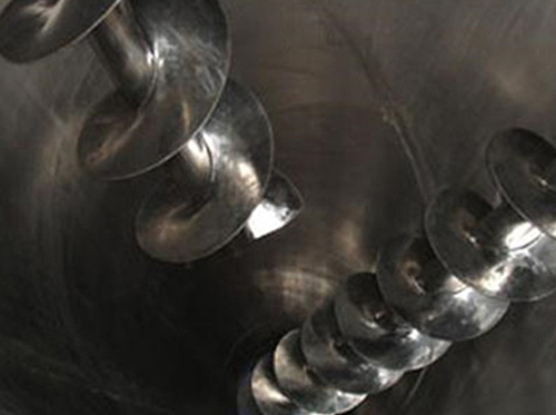 雙螺桿混合機由電機經減速機驅動特殊布置的螺帶主軸旋轉,外部的螺條將物料移到中心但置,內部的螺條將物料推到一定位置或端板,兩者使物料作相互擴散、對流、剪切、錯位和輻射狀運動,從而使物料在短時間內達到混合均勻的效果。有三種標準的攪拌設計 --- 連續式螺帶、斷續式螺帶和槳葉的設計是可以選用的。它們分到根據中心或底部卸料的要求進行排列。